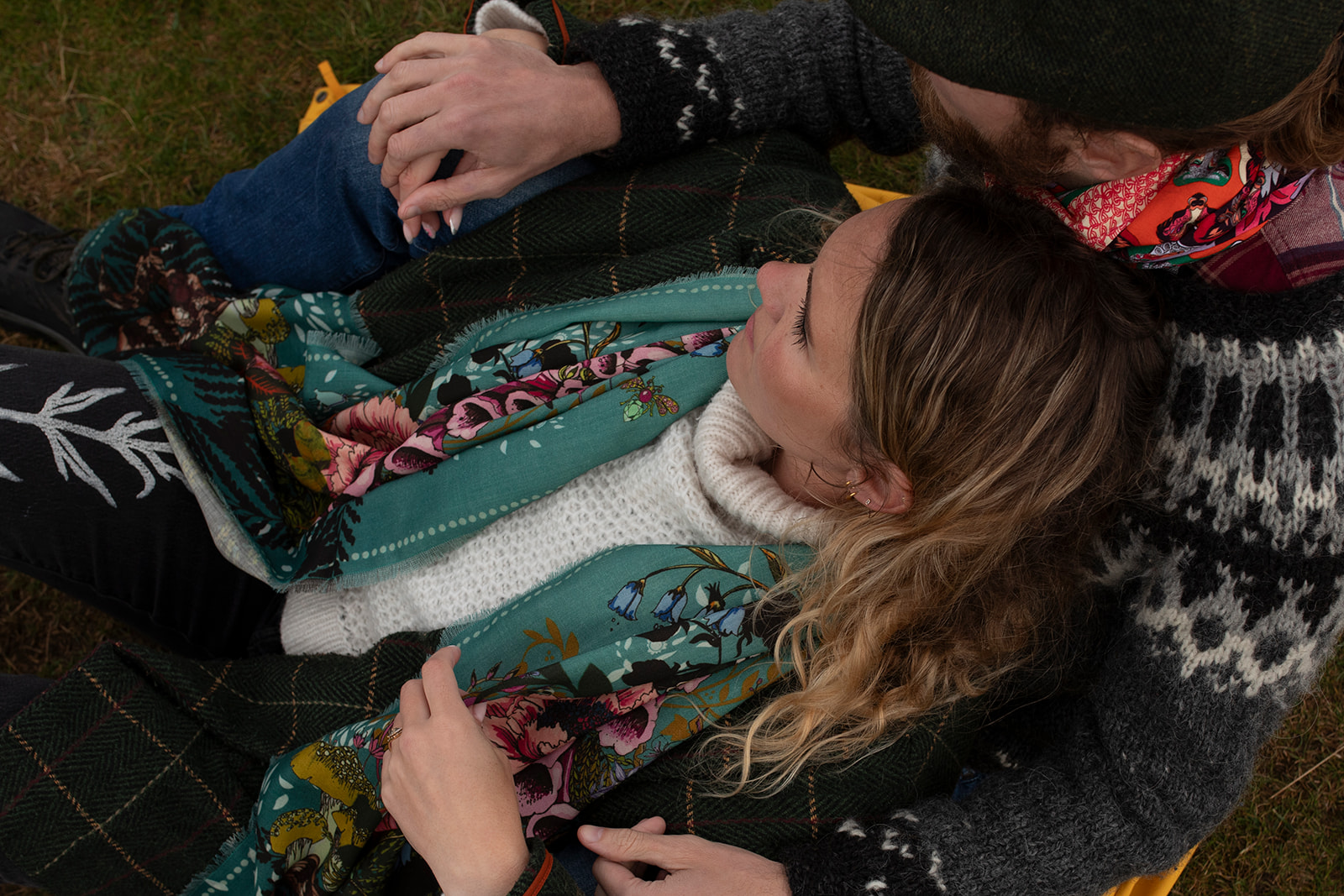 A beautiful petrol blue scarf that fades from bright teal to deep navy at the border. Featuring a bouquet of fragrant Summer blooms including poppies, foxgloves, bluebells and thistles, but look closer and find the hidden creatures amongst the tangle. Printed on 100% Wool 67x200cm Hand finished with a fringed edge Made in Scotland