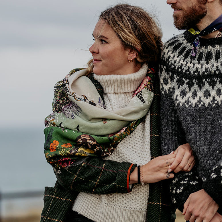 A beautiful deep green scarf that fades to soft pink at the centre. Featuring a bouquet of fragrant Summer blooms including poppies, foxgloves, bluebells and thistles, but look closer and find the hidden creatures amongst the tangle. Printed on 100% Wool 125x125cm Hand finished with a fringed edge Made in Scotland