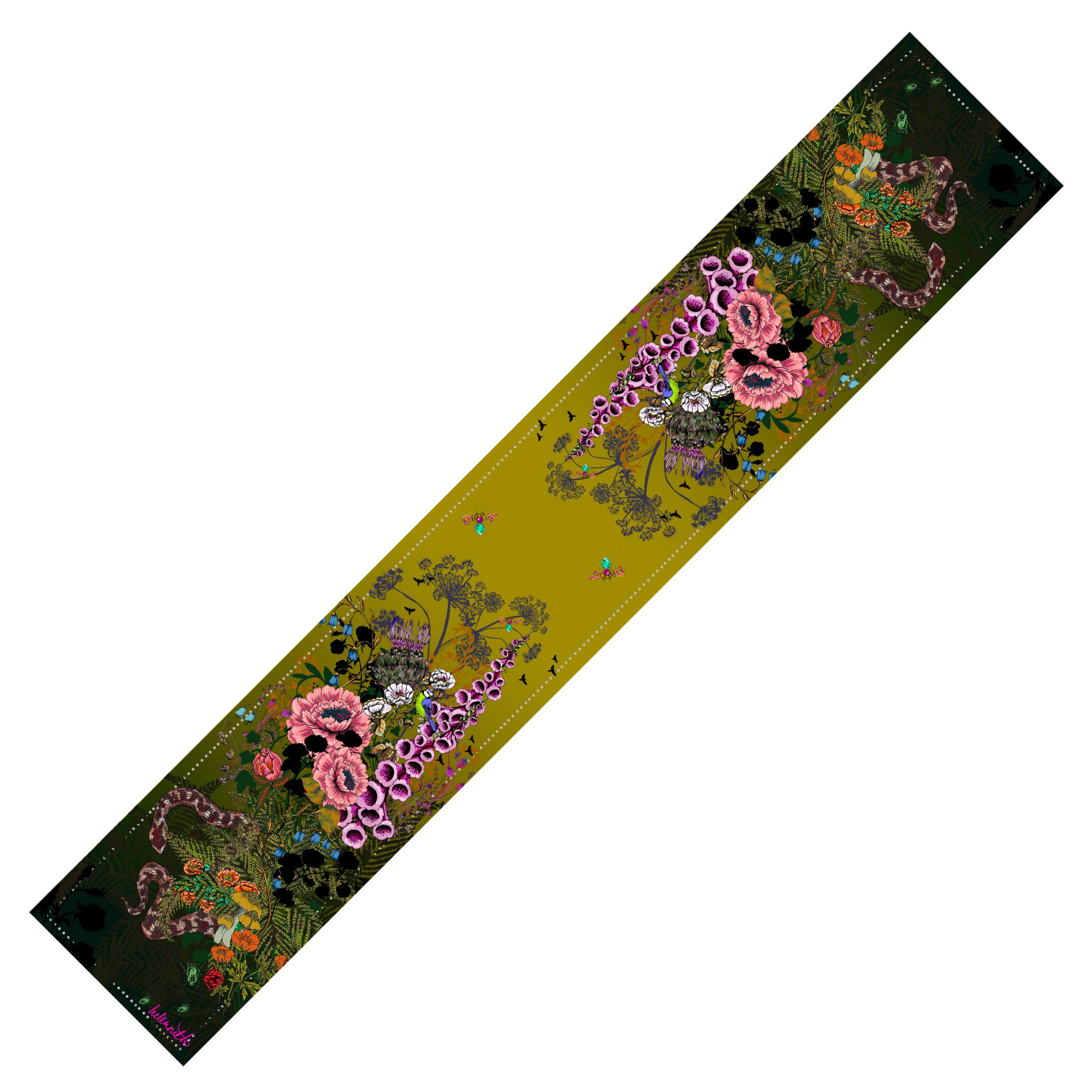 Silk skinny scarf in vivid greens and pinks, botanical theme with foxgloves, poppies, snakes and wild foliage.