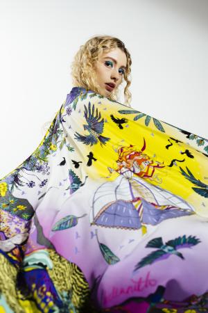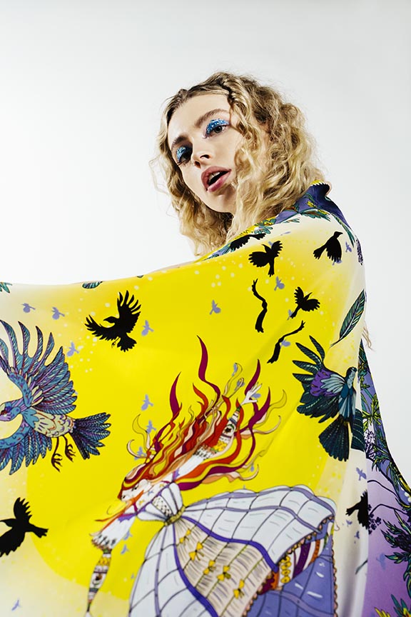 ‘Theory of Flight’ printed silk scarf featuring a flying Queen, soaring birds, fairytale landscapes and a tangle of wildflowers.