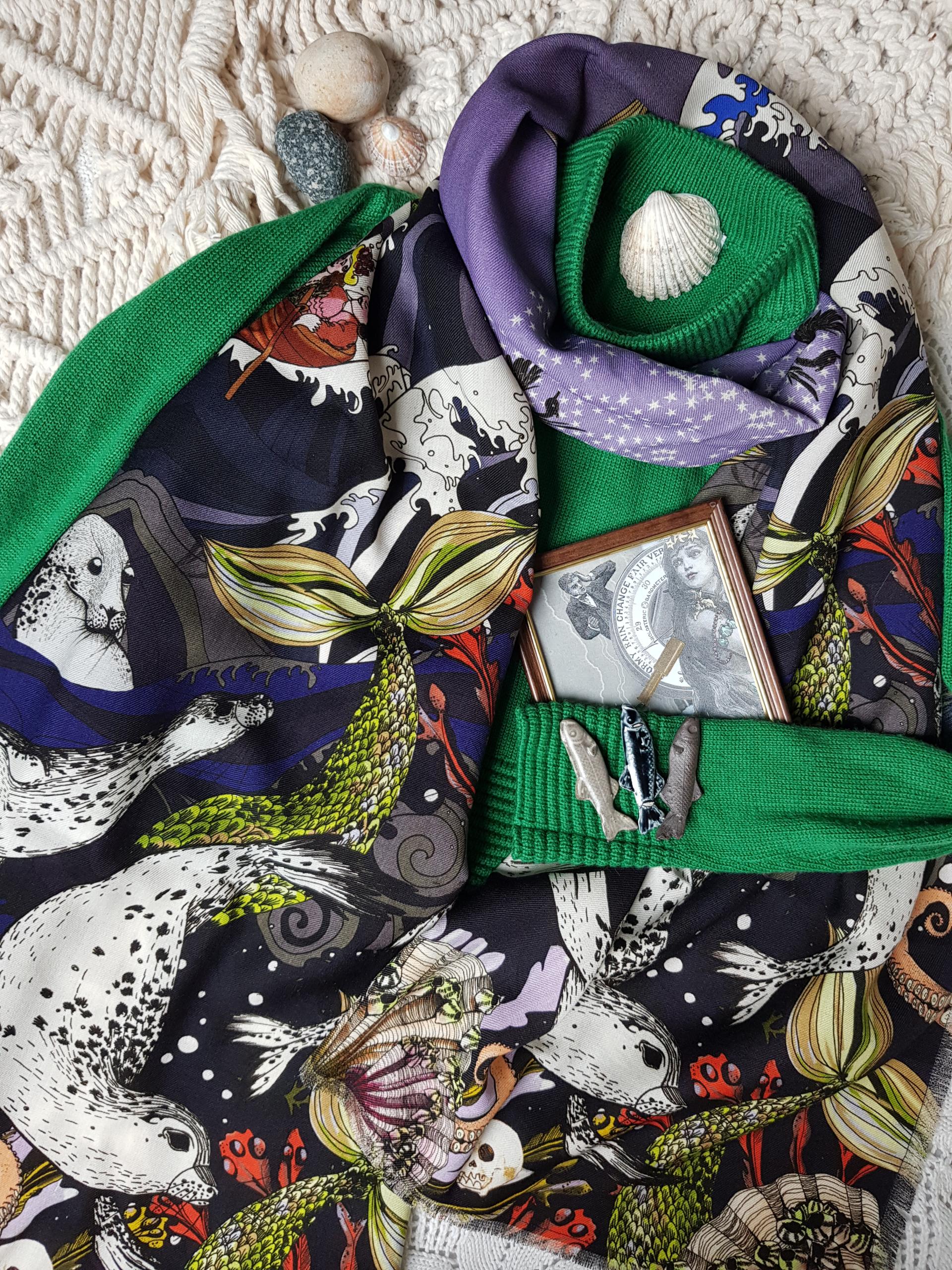 Seals and mythical creatures lurk beneath stormy sky and sea. This is a large wool twill scarf with a hand frayed edge. It’s large size allows for versatility in how you choose to style the piece. 67x200cm 100% Wool Twill
